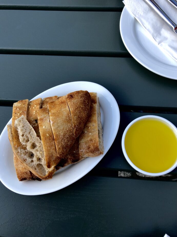 Etter noen få minutter får vi servert finskåret brød som dufter liflig av ild og gjær og dessuten en skål olivenolje jeg knapt har smakt maken til.