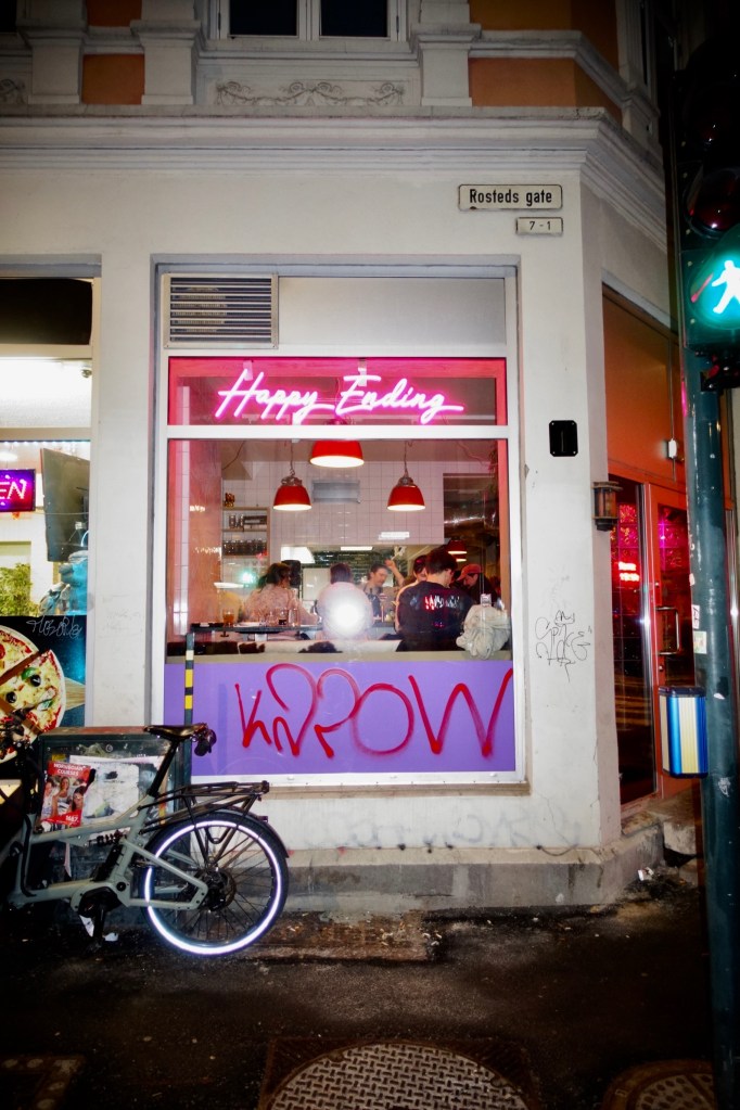 Happy Ending holder til et par hundre meter fra storebroren, nærmere bestemt i Rosteds gate 1 på Fredensborg. Nektar-gjengen har teamet opp med sterke krefter fra utelivsbransjen, blant annet Hilde Solli fra Dangerous Club – og laget et konsept som er like originalt som det er genialt: greasy nattmat og lekre cocktails.