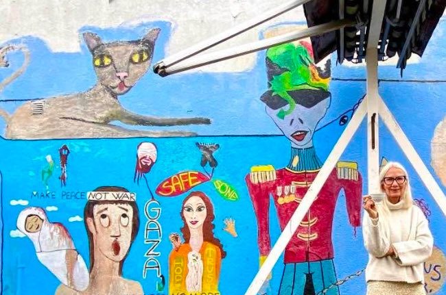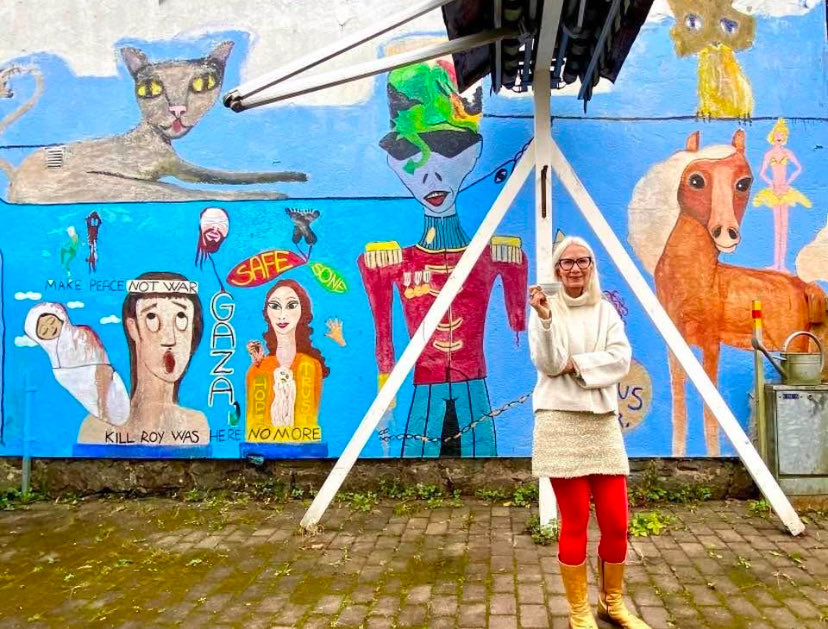 Janne i egen bakgård med egen kunst på veggene. Foto: Privat