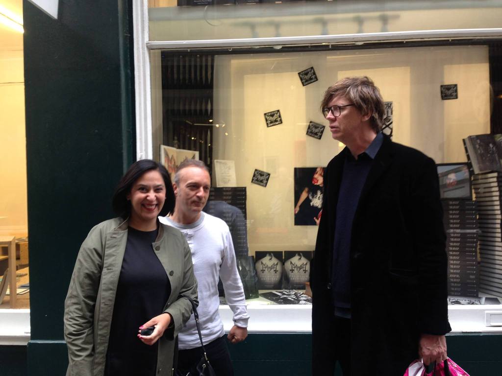 Khan-Østrem har alltid hatt med seg punkenes sekteriske og kompromissløse holdning fra Storbritannia: viktigheten av å ha en tydelig stemme, være kritisk og ikke la seg kommersialisere. Her under lanseringen av Death Archives med Jørn Stubberud fra Mayhem og Thurston Moore i London. En legendarisk kveld. (Foto: Privat)