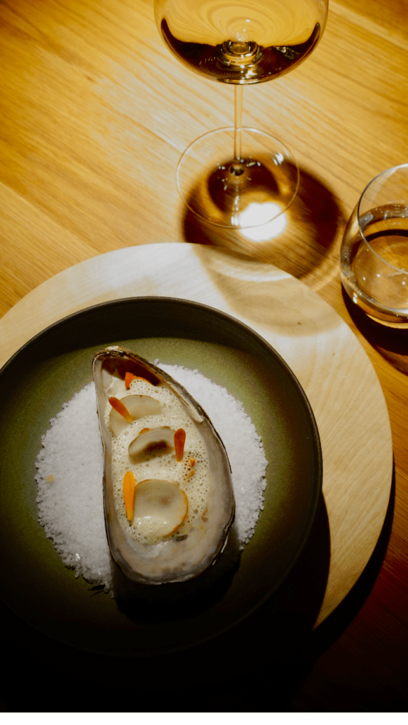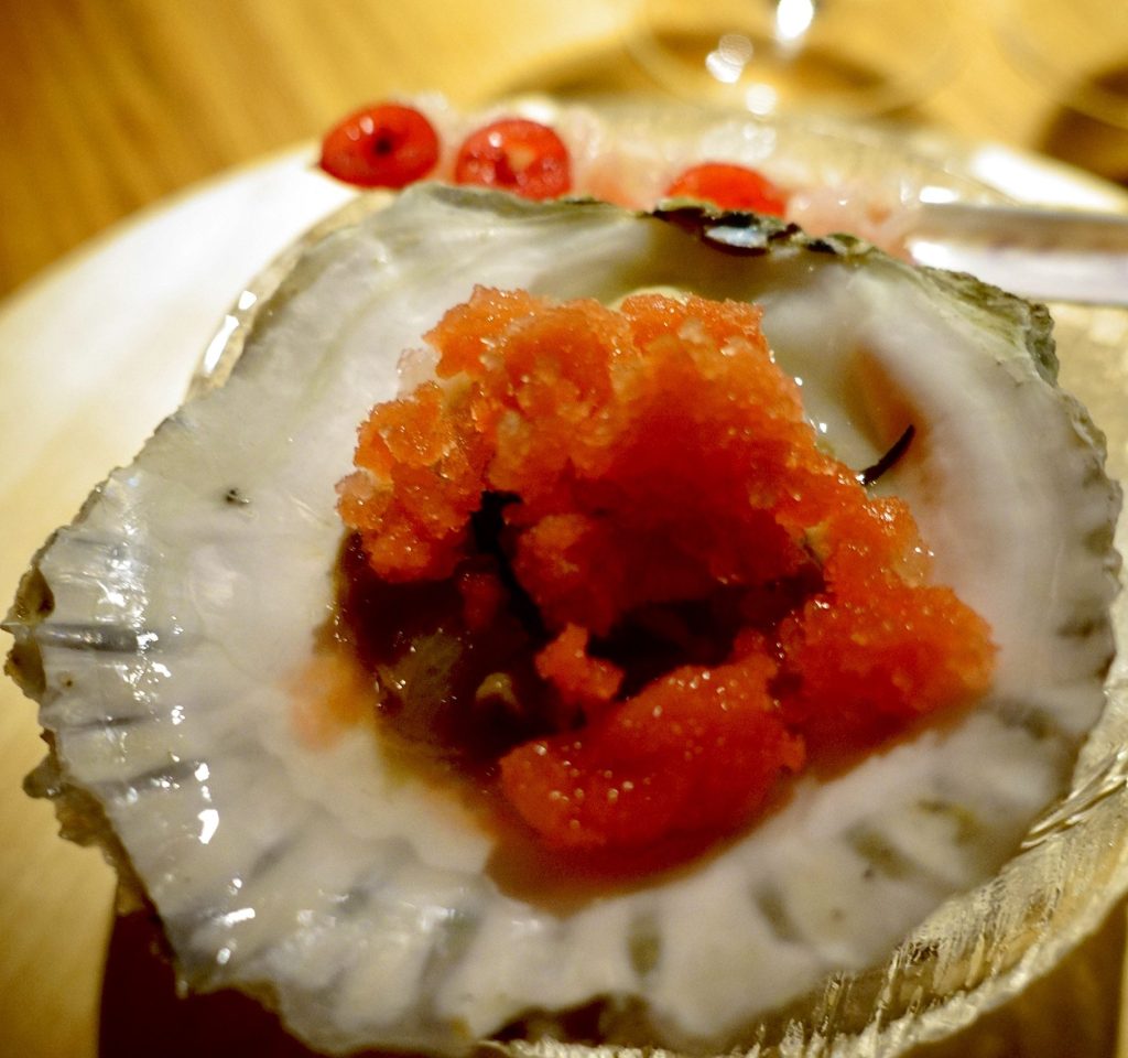 Krustade med sjøkreps, flatøsters og vinterreddik, knivskjell med saltede stikkelsbær, kamskjell med kastanje og bergamott, råreke, kuskjell, grillet sjøkreps. Akk! Det er noe tvers gjennom pirrende over de små kunstverkene som serveres i dempet belysning. Vi er mange som mister munn og mæle. Sjømat har utvilsomt x-faktor, delvis på grunn av sin dramatiske, nærmest voldelige struktur. Knivskarpe skjell og sjøkreps kan gi blodsmak i munnen, men avslører delikat, snøhvitt kjøtt på innsiden, mykt som smør. Vi suger ut alt kjøttet vi klarer fra det sprø og livsfarlige skallet.